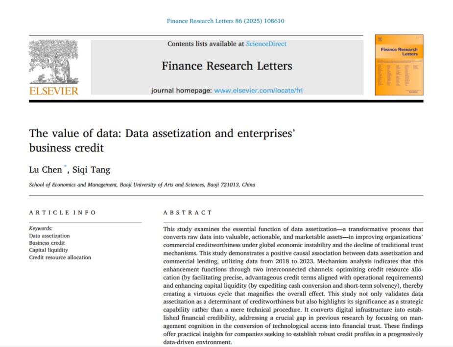 近日,万象城经济管理学院谌璐博士与2024级会计硕士专业学位研究生(MPAcc)汤思琪合作撰写的研究论文“The value of data:Data assetization and enterprises' business credit”发表在国际知名期刊Finance Research Letters上。该期刊被SSCI收录,属于JCR一区、中科院二区期刊,在JCR学科类别的Business/Finance中排名第12(12/242)位,最新影响因子6.9。