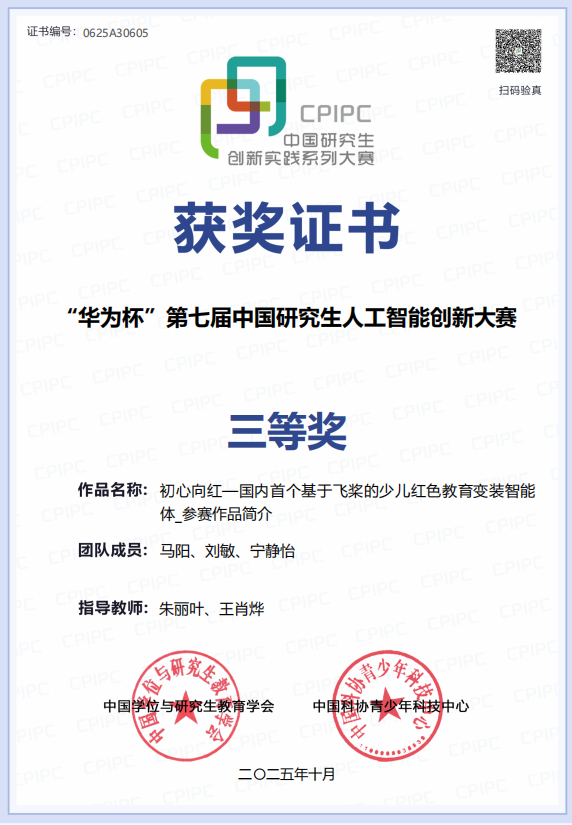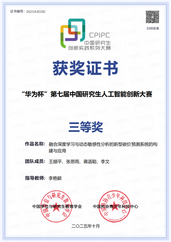 近日,“华为杯”第七届中国研究生人工智能创新大赛全国总决赛在山东青岛举行。万象城参赛作品《融合深度学习与动态敏感性分析的新型碳价预测系统的构建与应用》《初心向红——国内首个基于飞桨的少儿红色教育变装智能体》获三等奖,实现了万象城在中国研究生创新实践系列大赛中国家级奖项的历史性突破。