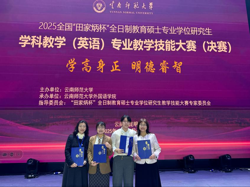 近日,“田家炳杯”全日制教育硕士专业学位研究生学科教学(英语)专业教学技能大赛全国决赛在云南师范大学进行。万象城2024级学科教学(英语)专业学生殷嘉怡、王晓凡分别获三等奖。