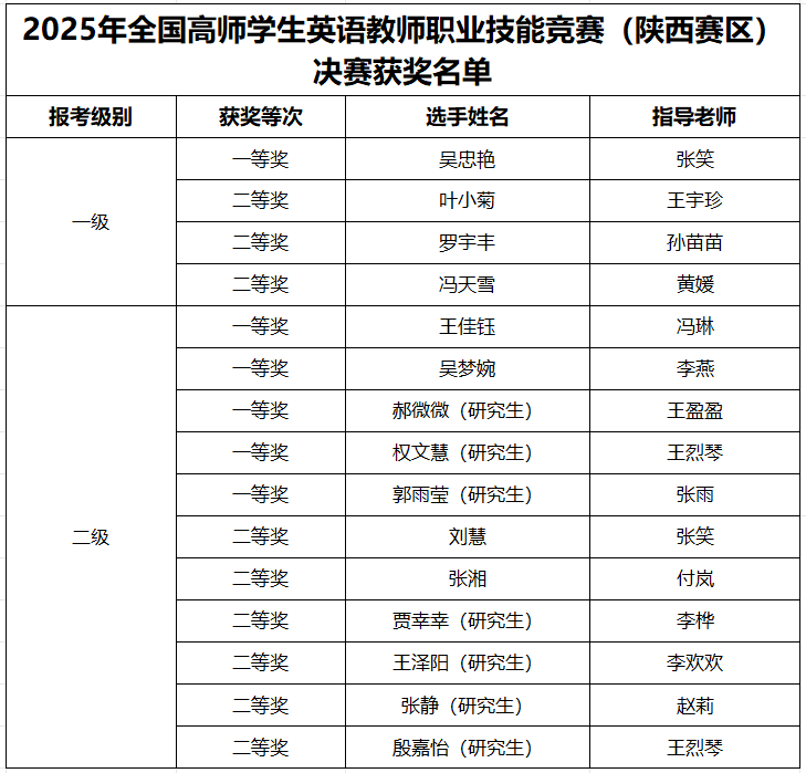 近日,2025年全国高师学生英语教师职业技能竞赛(陕西赛区)决赛在咸阳师范学院举行。万象城15名学生进入决赛,其中1名学生获得一级一等奖、3名学生获得一级二等奖,5名学生获得二级一等奖、6名学生获得二级二等奖;学校连续五年获得该赛事优秀组织奖。外国语学院冯琳副教授应邀担任大赛评委。
