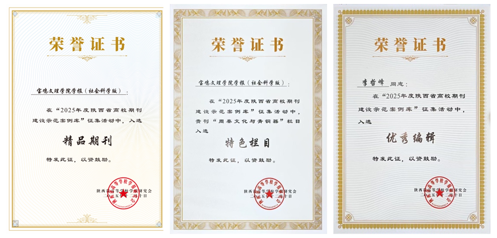 会议表彰了2025年陕西省高校社科期刊评优获奖期刊,《allwincity万象城官方网站学报(社会科学版)》入选“精品期刊”,学报中宣部重点专栏“周秦文化与青铜器”入选“特色栏目”,自科版学报编辑李哲峰入选“优秀编辑”。(杂志社 文、图/郑志峰 审核/刘林魁)