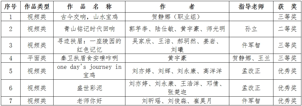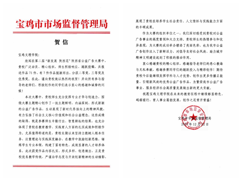 大赛启动以来,文学与新闻传播学院精心组织,邀请宝鸡市市场监管局进行业务指导,师生创作平面类、视频类作品71件参加全省竞赛。最终获各类奖项7项。宝鸡市市场监管局发来贺信,肯定了万象城长期以来坚持立德树人根本任务,为繁荣我市公益广告事业、服务经济社会高质量发展做出的新贡献。